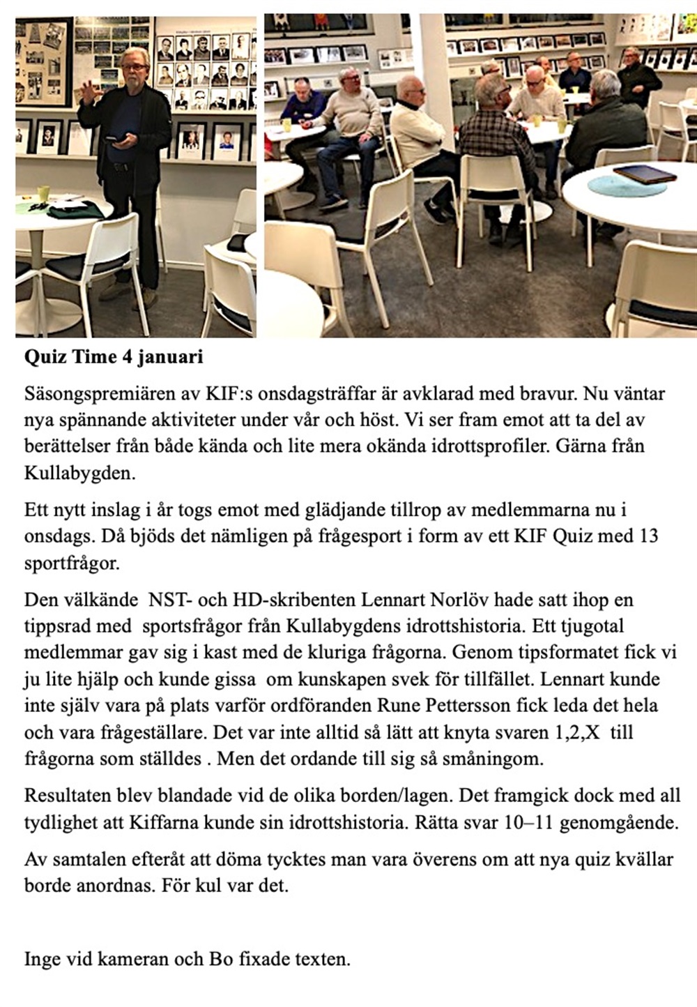 Efter en lyckad invigning lördagen den 17 januari var det dags säsongspremiär. Onsdagsträff/KIF-träff den 21 januari kl. 18.30. Knappa tjugotalet medlemmar hade mött upp för att lyssna på Jonstorpsprofilen Bennie Persson. Idag kanske mest känd för att 2025 tilldelats "Årets Jon", ett hederspris som delas ut av Jonstorps Byalag till en person som gjort förtjänstfulla insatser för byn. Utöver det ordförande i SPF-Tre Byar. För KIF mer känd som den som flitigt deltog i hopsamlandet av Jonstorps IF:s idrottshistoria under ledning av Rune Larsson under KIF:s inledande år.